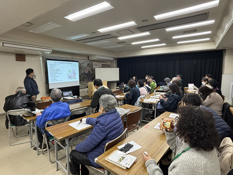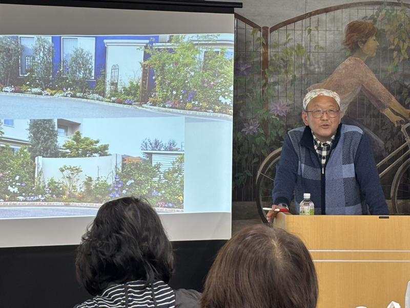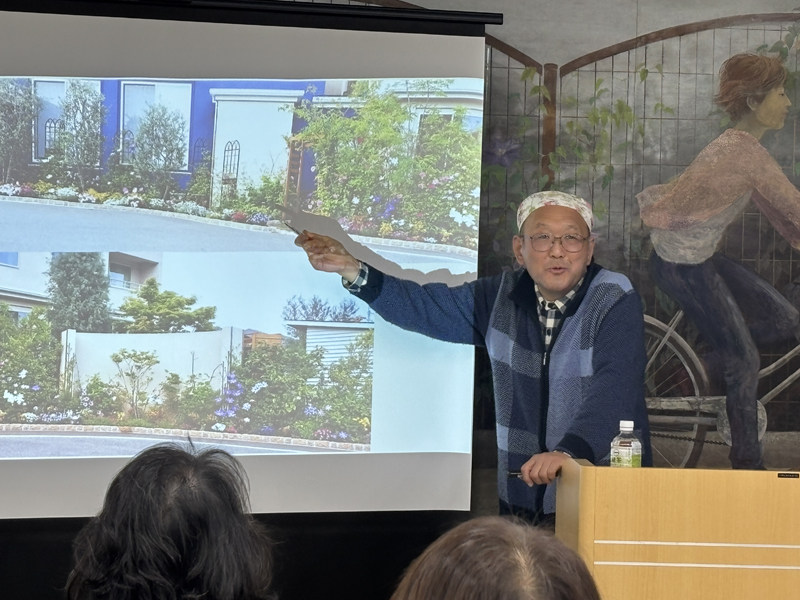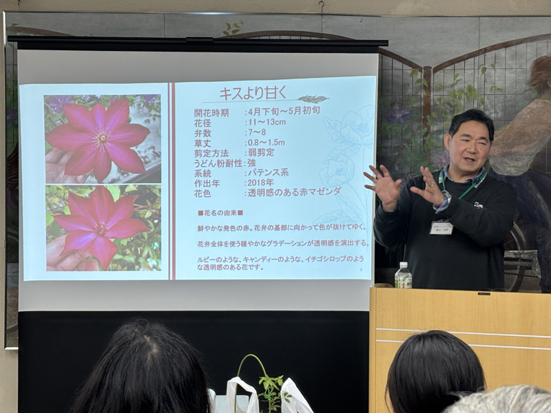 金子先生のお話は各地のクレマチスを植えたオープンガーデンの植栽も含めたお話、北から南までその土地での花の時期の違いによる花の並びも写真から大変興味深く知ることが出来ました。
