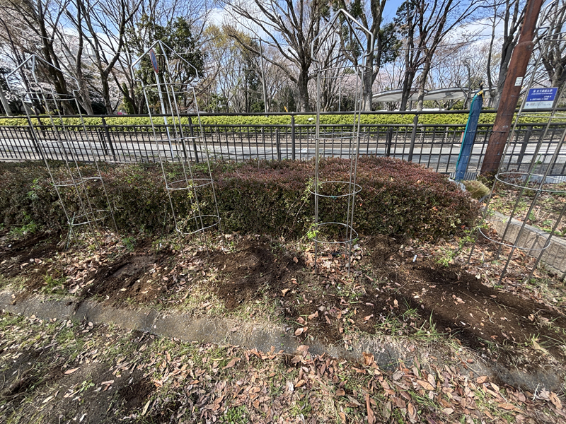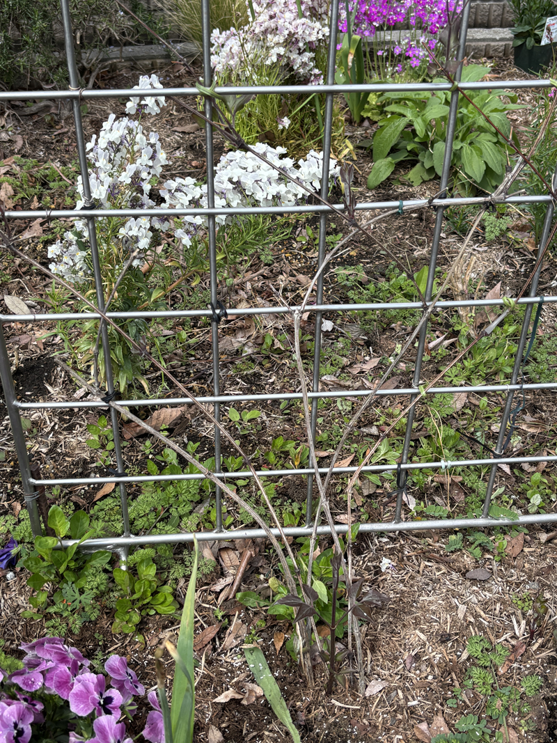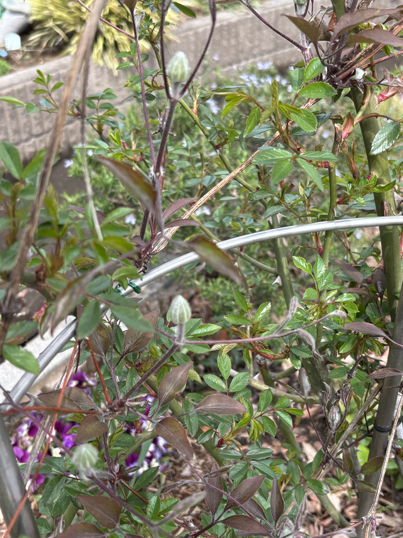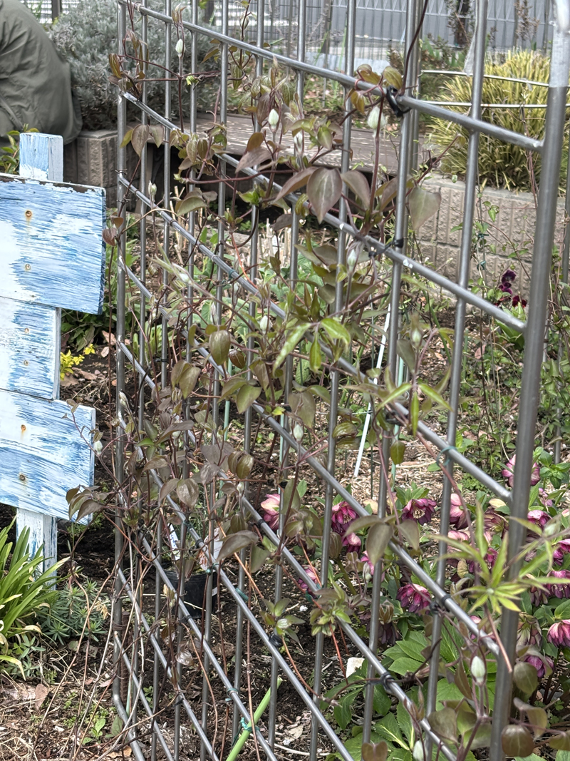 ガーデン左側のオベリスク4本に、先日レスキューしました名前がわからないクレマチスを植え付けました。