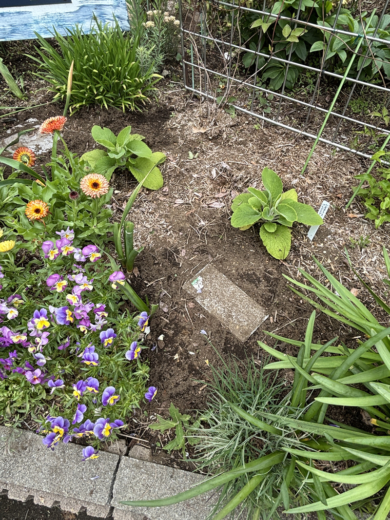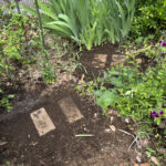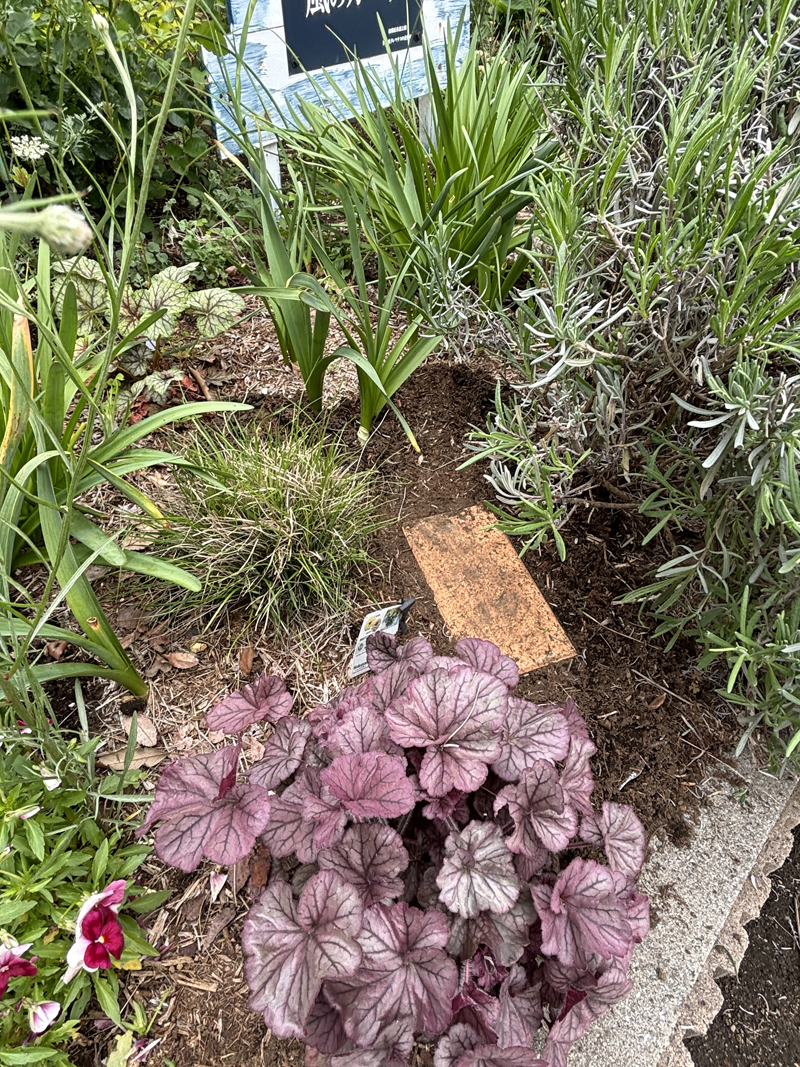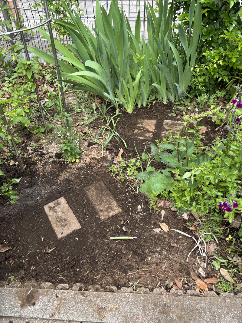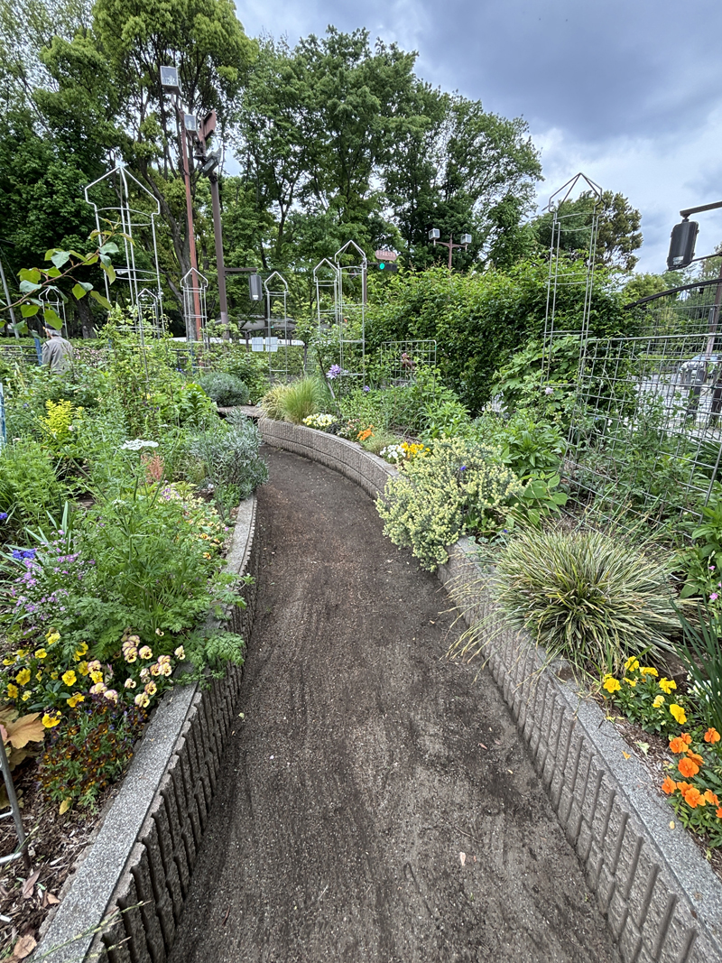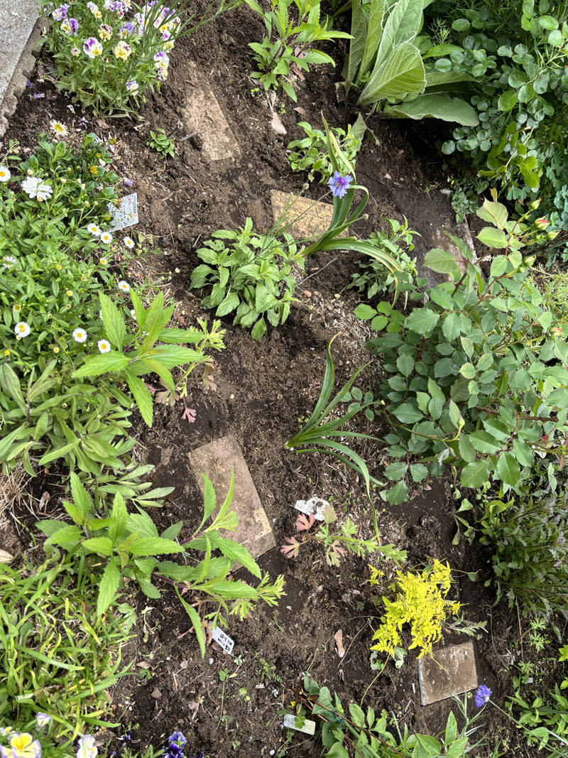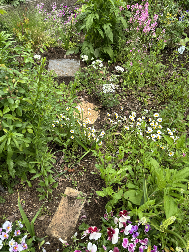 まず5人で手前の島のレンガの足場を決めて、堀り、はめ込みプレス。足運びを確認しながら作業中に便利な足場を作ってので、後ろの島にも取り掛かりました。(続きは次回)カラフルないろんなレンガがガーデンに取り込まれ、彩りを添えました。