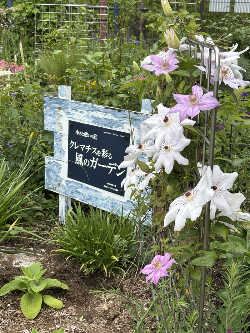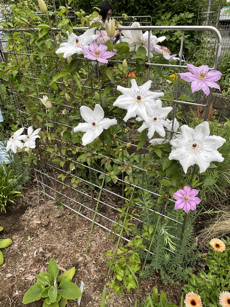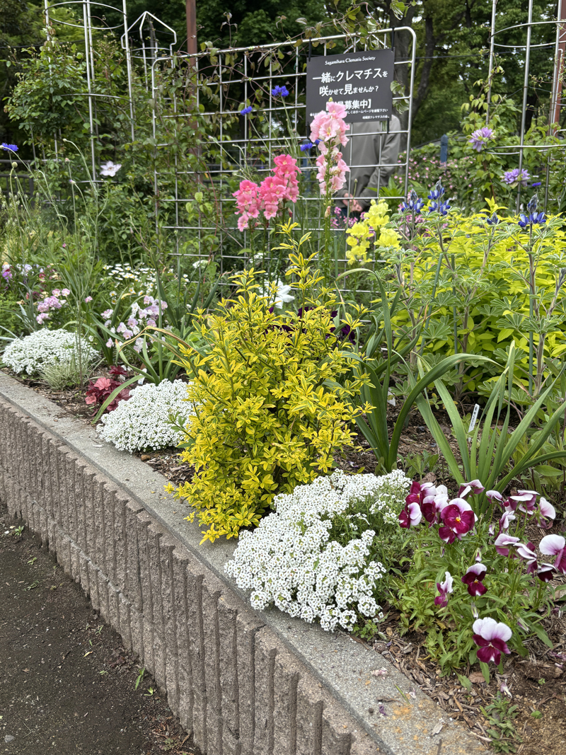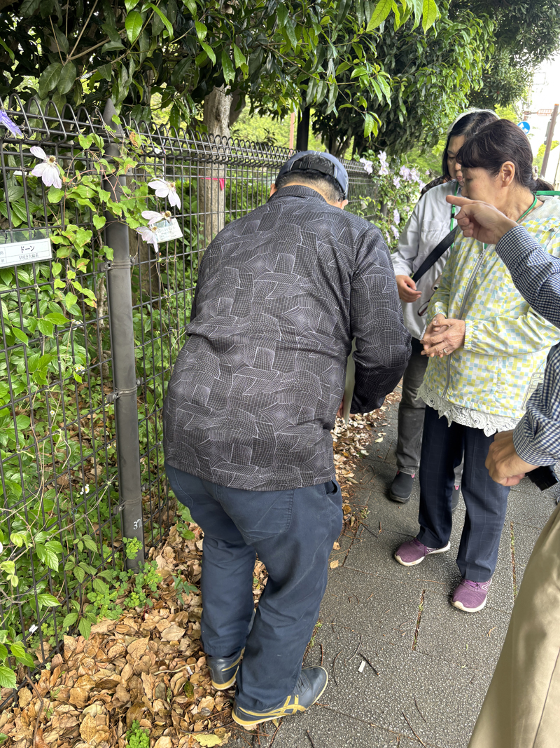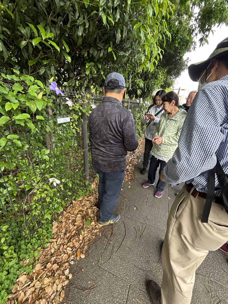その後外に出てフェアで来場者の案内をするためのクレマチスガイド用のコースの確認と、咲きそうな花と咲いてる花の確認を公園管理の薮内さんも交えて実際に歩いて行いました。公園内のフェンスは早咲きが多いので咲きだしていました。