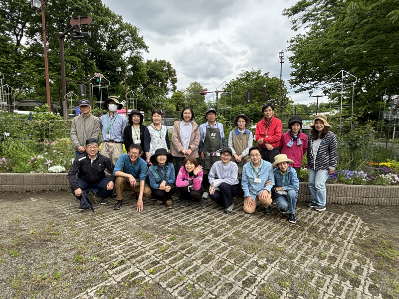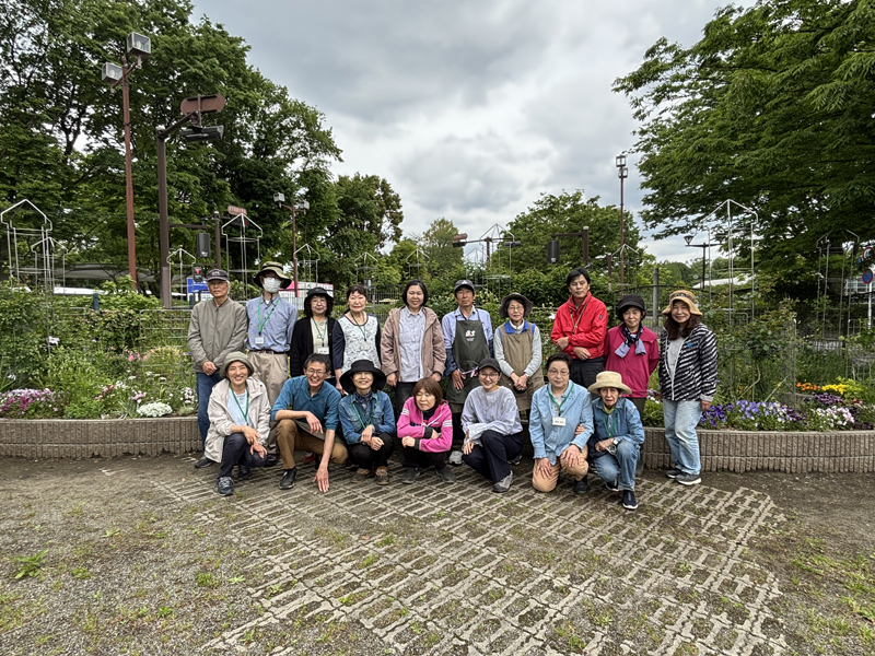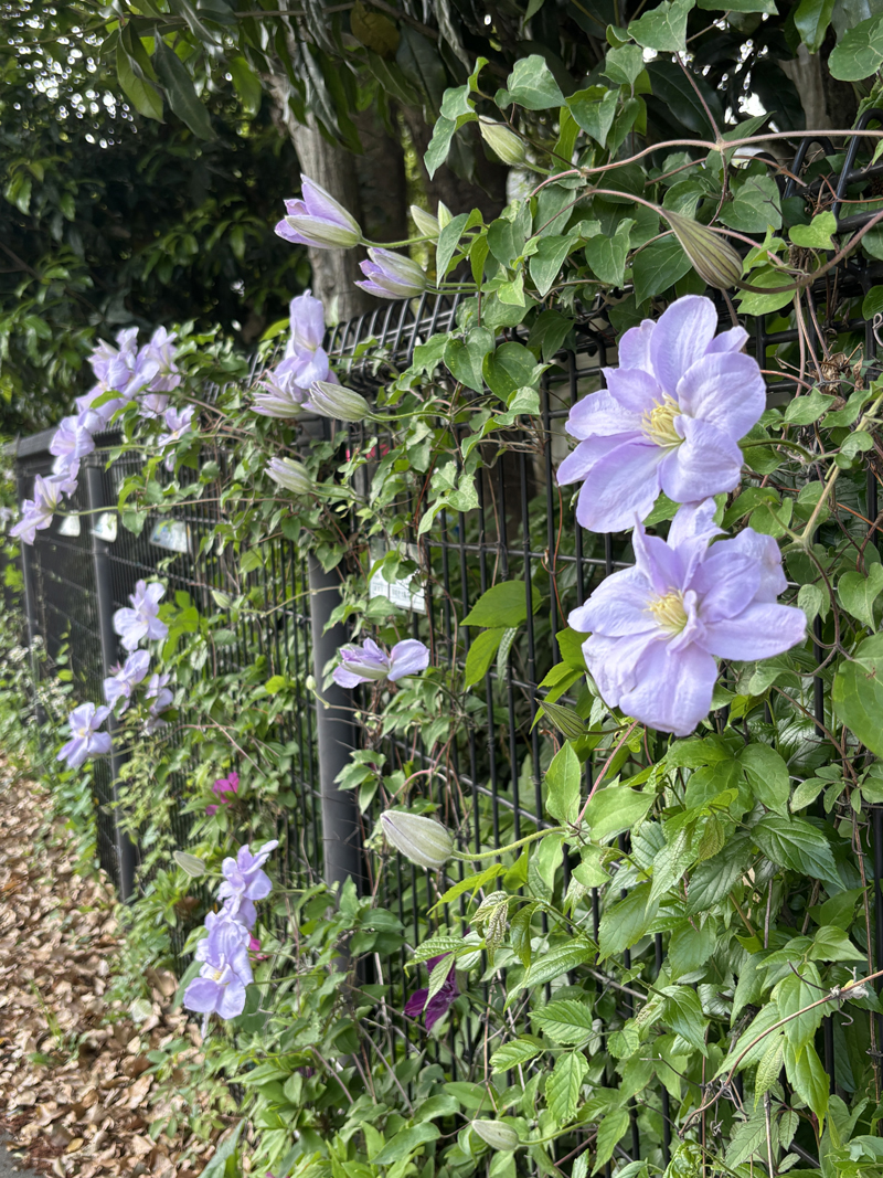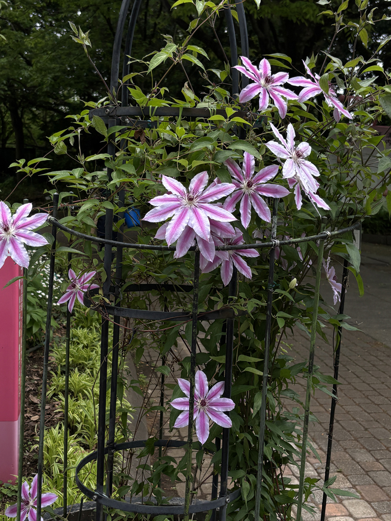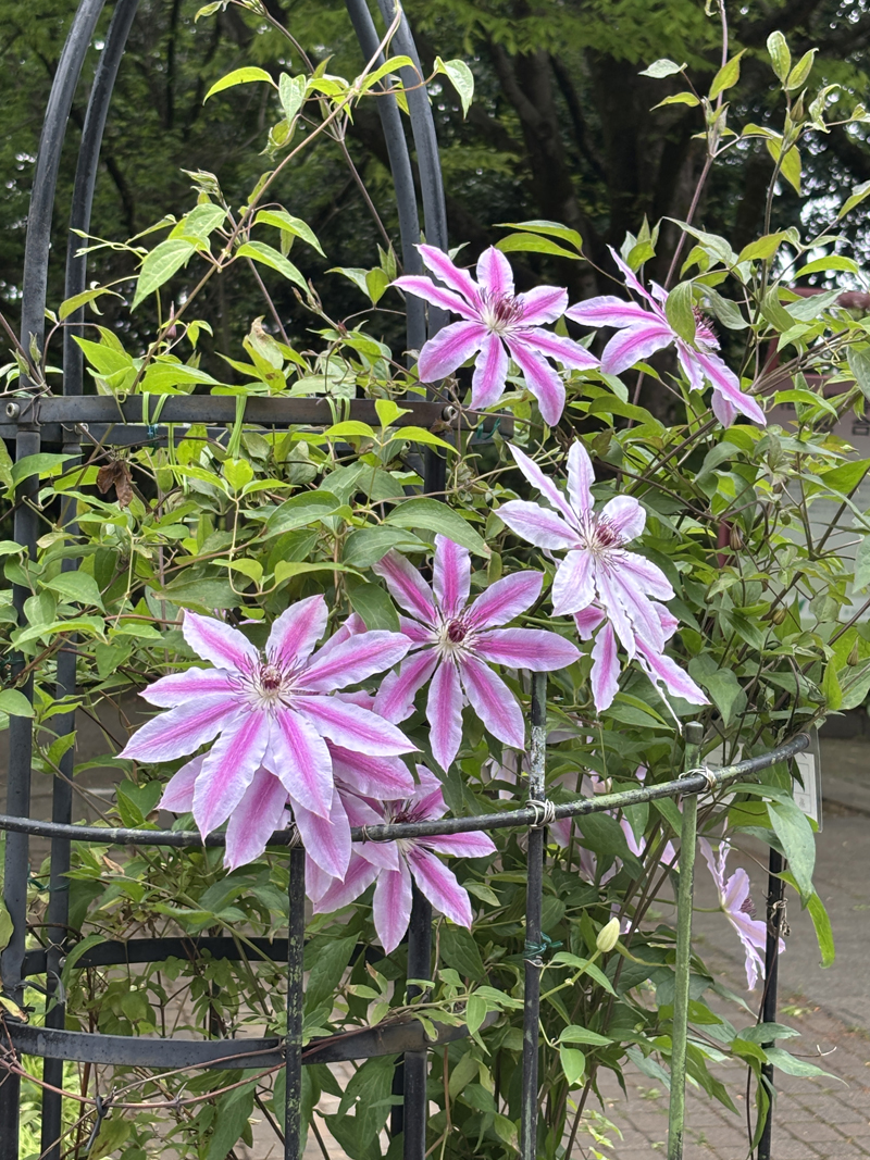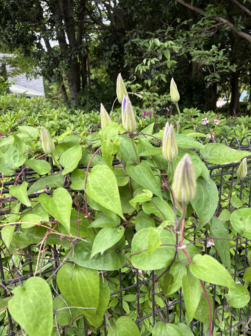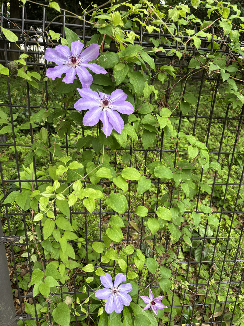 その後外に出てフェアで来場者の案内をするためのクレマチスガイド用のコースの確認と、咲きそうな花と咲いてる花の確認を公園管理の薮内さんも交えて実際に歩いて行いました。公園内のフェンスは早咲きが多いので咲きだしていました。