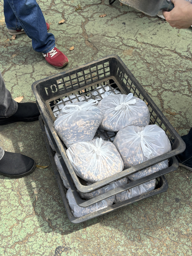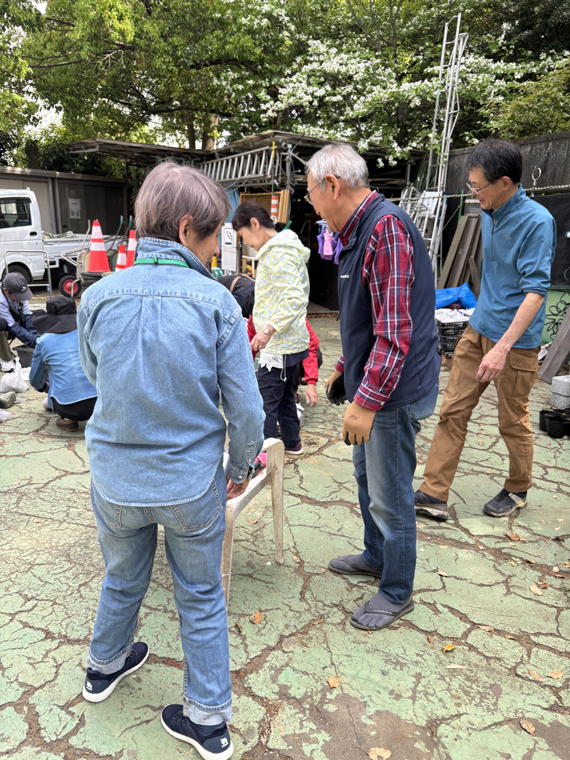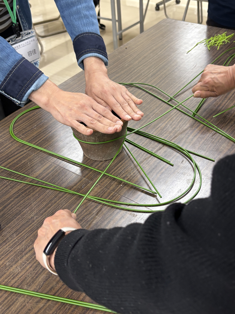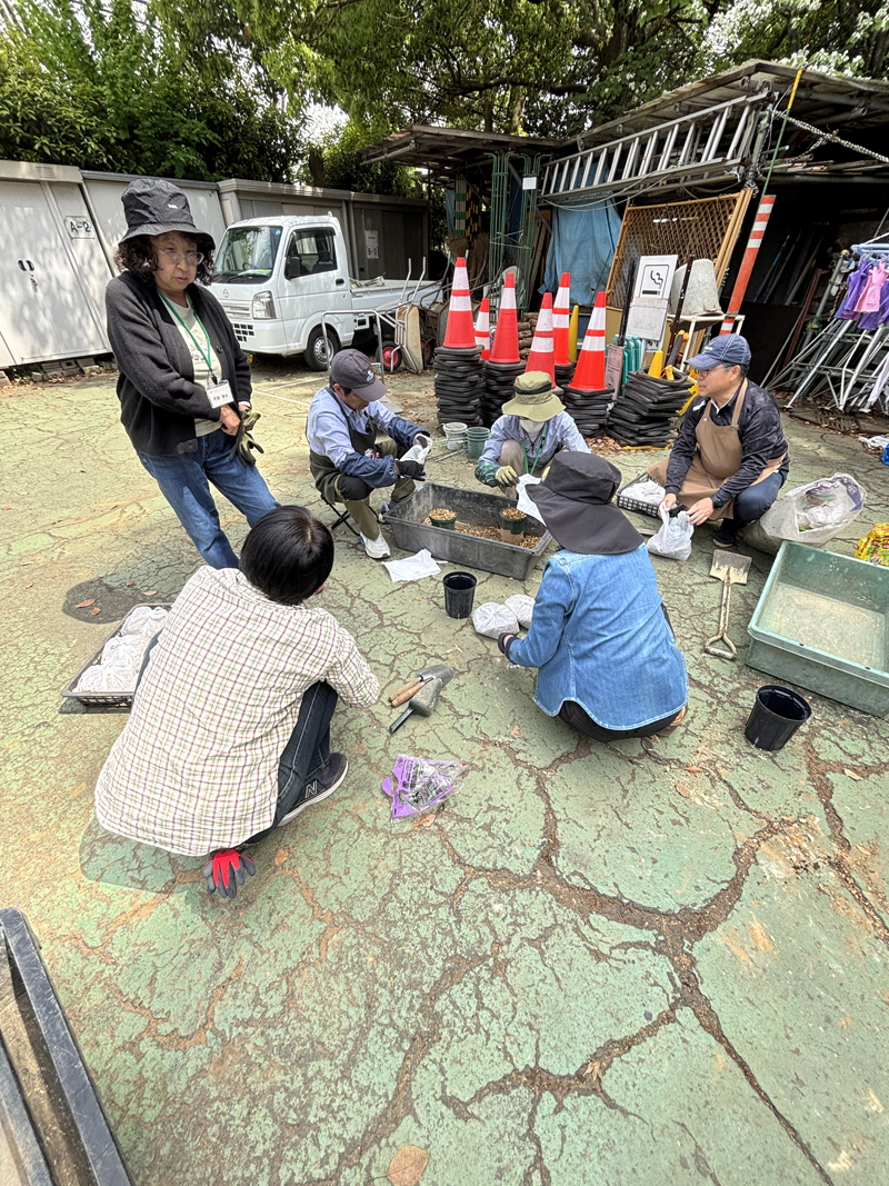 事務所に戻ってからは、昼食後にフェアで販売する支柱にカーブをつける作業を女性グループが行い、男性中心に土づくりを行い、袋詰めをして80袋の用意ができました。